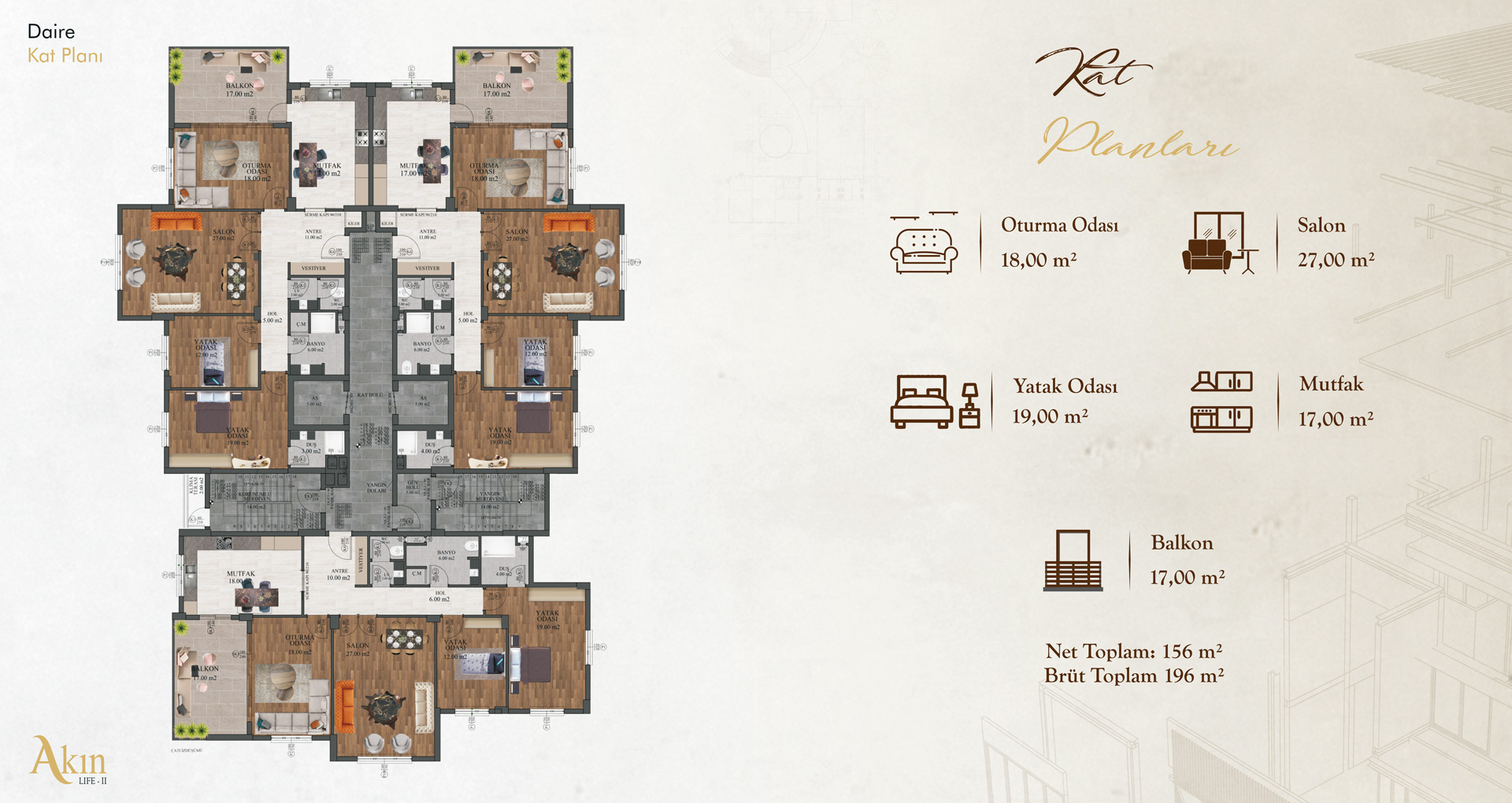 Akın Life II Projesi, 11 katlı olup 3+1 toplam 34 daireden oluşuyor. Projede yer alan tüm daireler özenle düşünülmüş mimari detaylarıyla AYVAZOĞLU YAPI kalitesini sunuyor.